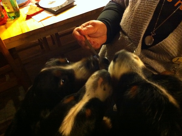 Imagine Ghianti to be able to celebrate as swedish champion together with her "lover "in Gothenbourg, 8 months after the puppies were born. In the picture Maggan is serving the dessert to Ghianti, Maxi and their daughter Musella. Anyone doubting we enjoy ourselves in Gothenbourg?