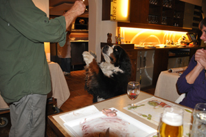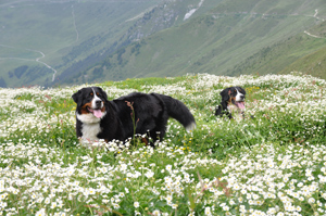 Om vi tok heisen høyere opp eller bare vandret rett fra hotellet, her var det turmuligheter i alle retninger. Terrenget var utrolig flott. Rammen rundt var de hvitkledde toppene, men selv opp til 2500 meter var det de grønne engene som regjerte mens små lekne bekker boltret seg nedover og skapte fine vannhull langs stien. Hundene kunne ikke hatt det bedre og det ble knipset bilder jevnt og trutt. Motivene dukket opp som perler på en snor etterhvert som de firbeinte lekte seg sammen i blomsterengen. Vi kunne skrevet en bok om denne turen , men bildene for tale for seg. Vi vil bare få takke Dan for hans gjestfrihet og hans entusiasme for dette stedet. Han, og hans firbente venn Nalle (9 år gammel berner), var med oss på flere turer og Dan kjenner stedet meget godt. Vi fikk derfor førsteklasses guiding ved en hver anledning. Dan og Nalle lever harmonisk i denne byen og Nalle går fritt omkring overalt. Selv på restauranter er det bar å ta med hund og dette måtte vi selvfølgelig prøve ut. Vi troppet opp på en av Dan's stamrestauranter med 8 bernere og ble tatt i mot med åpne armer. Serveringen gikk knirkefritt selv om det kan være en utfordring å balansere biffen blant 32 berner-legger som sprer seg på gulvet. Selvfølgelig vanket det også noen skikkelige godbiter til hundene til slutt. Takk for samværet Dan, takk for alle verandadiskusjonene og takk for at vi løste verdensproblemene sammen.. Takk også til våre flotte turkamerater fra Kongsberg som gjorde dette til en herlig opplevelse. Til slutt. Takk til Achilles og Hedda, Gianti og Amici, Dee Dee, Haydn og Aida for at dere er til, for at dere drar oss ut av sofaen hver dag og får oss til å legge ut på slike turer, helt uten doping..