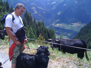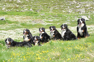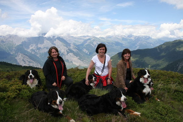 Hit kommer altså alpinistene, syklistene og musikerne. Vi er ingen av delene. Vi er hundefolk og vi dro dit med 7 bernere. Torsdag 02. juli fylte vi bilene med klær for alle værtyper, 80 kg hundefor og 300 kg med velvaksinert bikkje. Og vi, det er våre kjære venner fra Kongsberg, Else Marie/Hans Reidar og Trine/Kai Inge og oss to Hvalbernere. Tre forventningsfulle par rullet raskt gjennom Tyskland og klatret opp Verbier-bakkene uten melkesyre for å ta inn på vår venn Dan's lille alpe Hotell midt i smørøyet. Vi ville til Bernerens hjemland, vi ville ha fotturer med hundene i høyfjellet og vi ville leve herrens og hundens glade dager. Og gjett om vi det fikk.