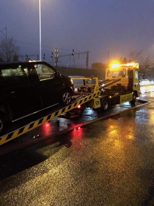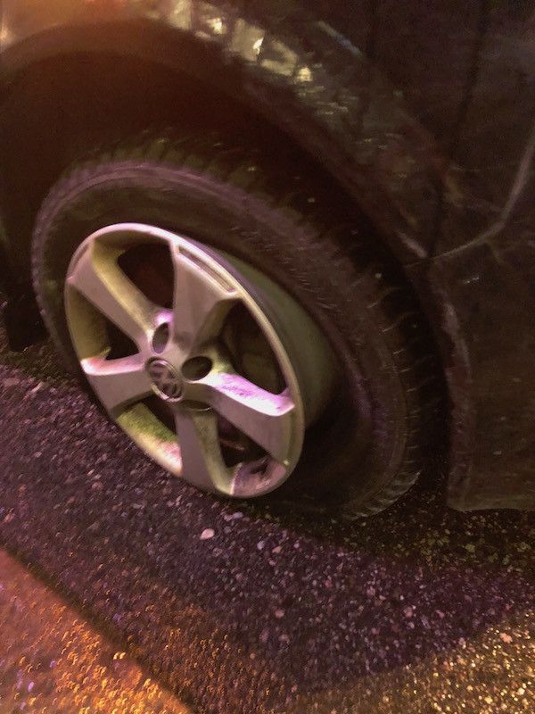 Og der stod vi 1 km fra utstillingshallen første dagen midt i rushtrafikken. Heldigvis var det bare hjulet som var skadet.