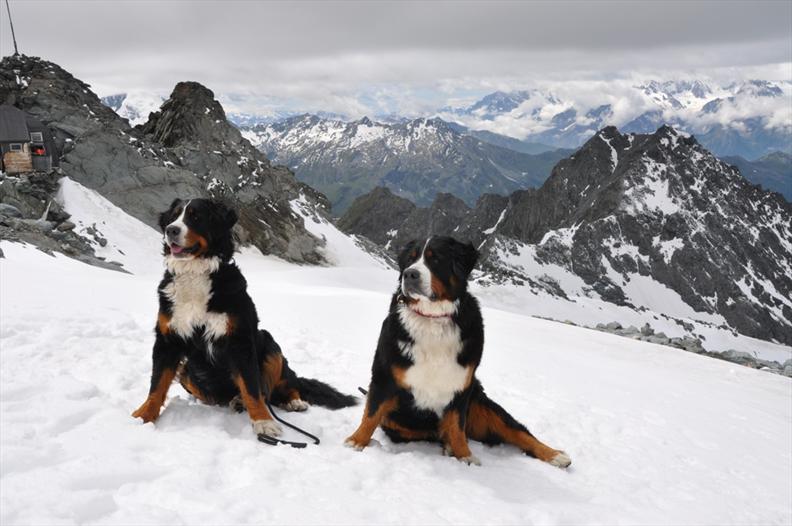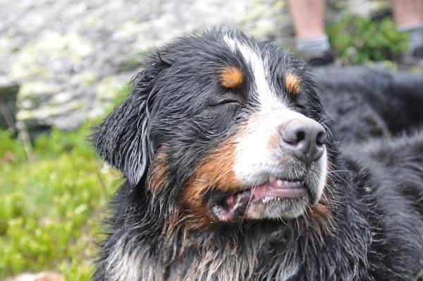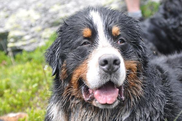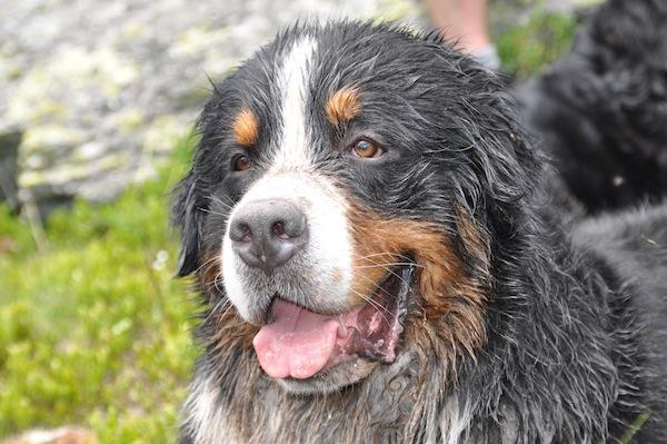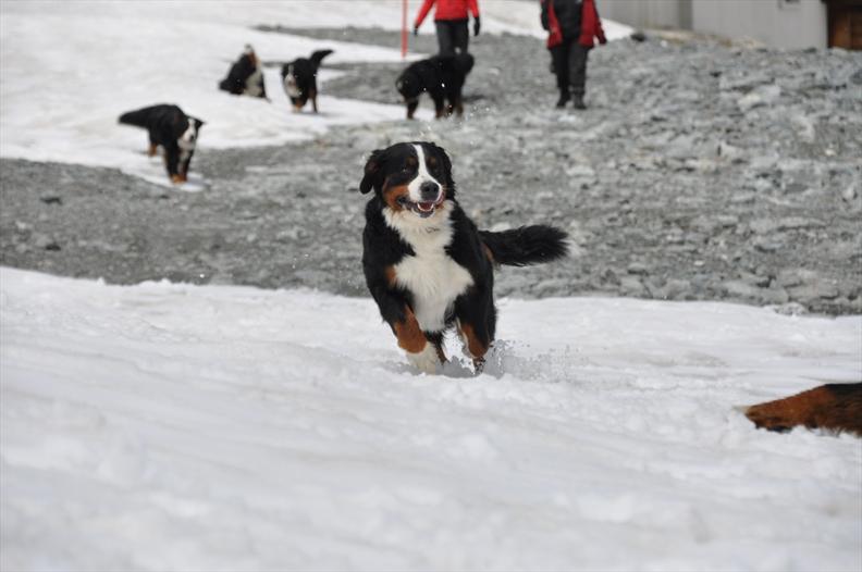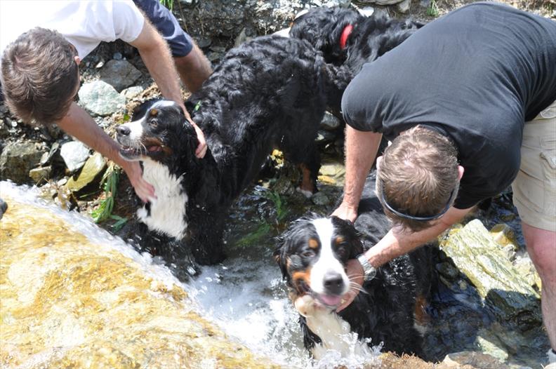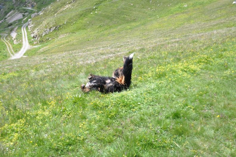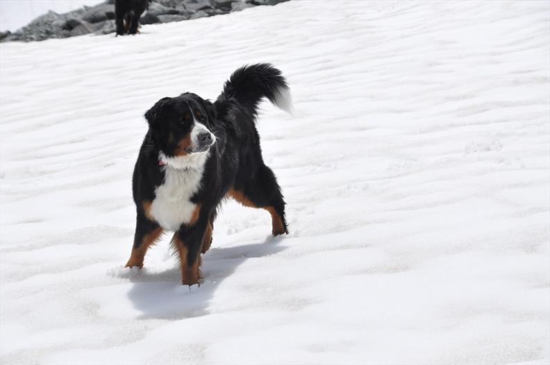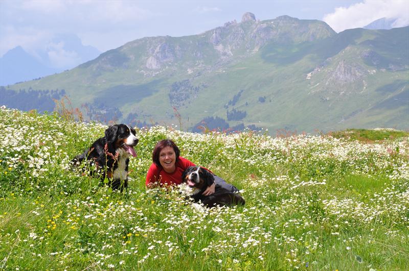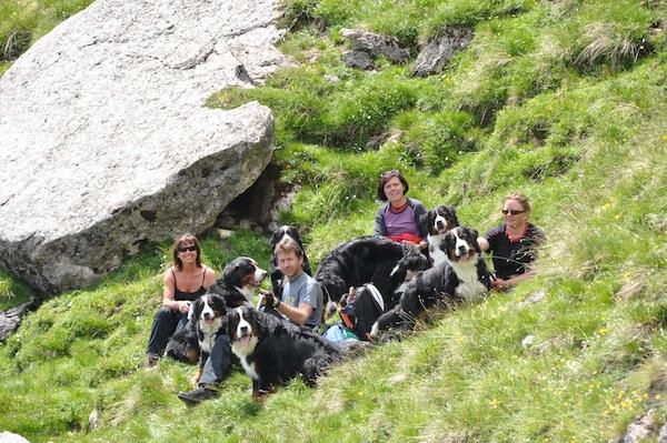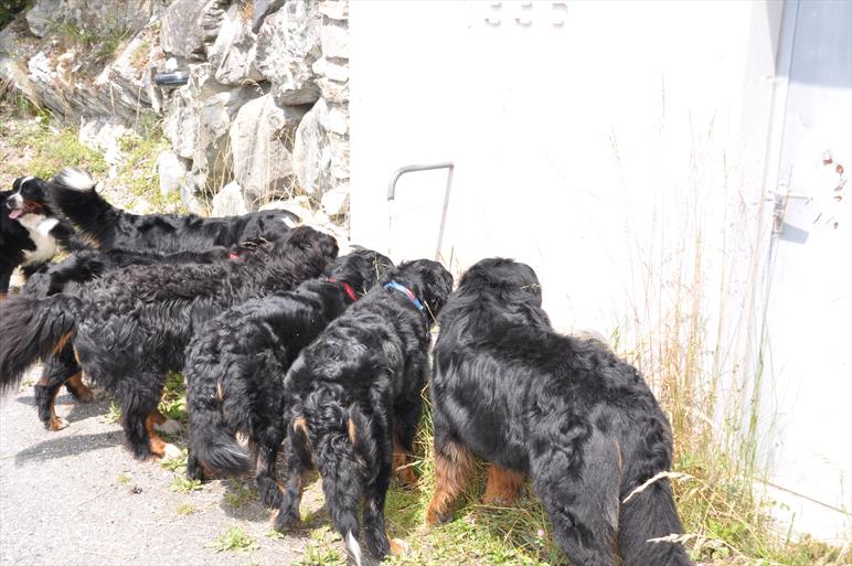 Om vi tok heisen høyere opp eller bare vandret rett fra hotellet, her var det turmuligheter i alle retninger. Terrenget var utrolig flott. Rammen rundt var de hvitkledde toppene, men selv opp til 2500 meter var det de grønne engene som regjerte mens små lekne bekker boltret seg nedover og skapte fine vannhull langs stien. Hundene kunne ikke hatt det bedre og det ble knipset bilder jevnt og trutt. Motivene dukket opp som perler på en snor etterhvert som de firbeinte lekte seg sammen i blomsterengen. Vi kunne skrevet en bok om denne turen , men bildene for tale for seg. Vi vil bare få takke Dan for hans gjestfrihet og hans entusiasme for dette stedet. Han, og hans firbente venn Nalle (9 år gammel berner), var med oss på flere turer og Dan kjenner stedet meget godt. Vi fikk derfor førsteklasses guiding ved en hver anledning. Dan og Nalle lever harmonisk i denne byen og Nalle går fritt omkring overalt. Selv på restauranter er det bar å ta med hund og dette måtte vi selvfølgelig prøve ut. Vi troppet opp på en av Dan's stamrestauranter med 8 bernere og ble tatt i mot med åpne armer. Serveringen gikk knirkefritt selv om det kan være en utfordring å balansere biffen blant 32 berner-legger som sprer seg på gulvet. Selvfølgelig vanket det også noen skikkelige godbiter til hundene til slutt. Takk for samværet Dan, takk for alle verandadiskusjonene og takk for at vi løste verdensproblemene sammen.. Takk også til våre flotte turkamerater fra Kongsberg som gjorde dette til en herlig opplevelse. Til slutt. Takk til Achilles og Hedda, Gianti og Amici, Dee Dee, Haydn og Aida for at dere er til, for at dere drar oss ut av sofaen hver dag og får oss til å legge ut på slike turer, helt uten doping..