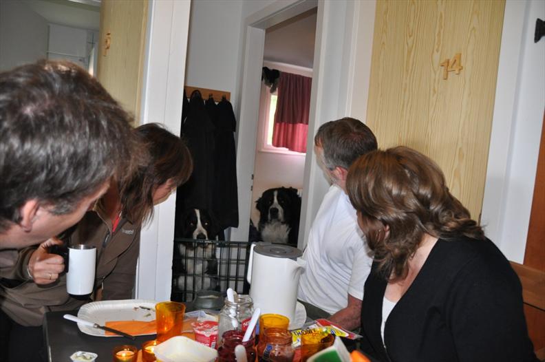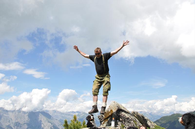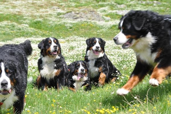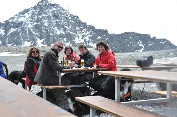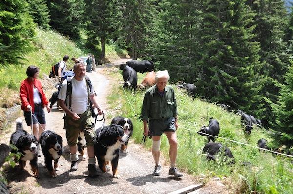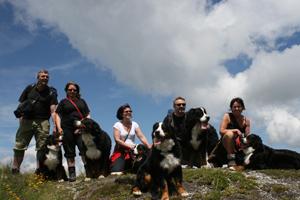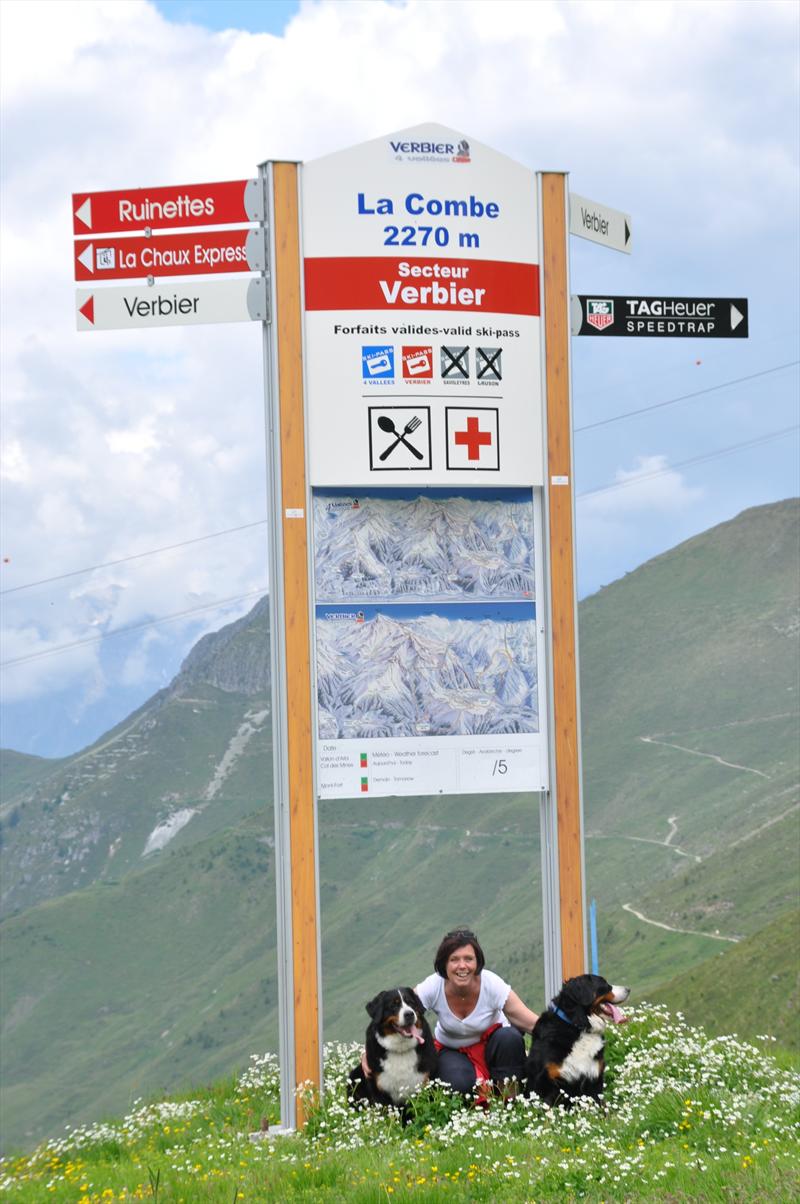 Hit kommer altså alpinistene, syklistene og musikerne. Vi er ingen av delene. Vi er hundefolk og vi dro dit med 7 bernere. Torsdag 02. juli fylte vi bilene med klær for alle værtyper, 80 kg hundefor og 300 kg med velvaksinert bikkje. Og vi, det er våre kjære venner fra Kongsberg, Else Marie/Hans Reidar og Trine/Kai Inge og oss to Hvalbernere. Tre forventningsfulle par rullet raskt gjennom Tyskland og klatret opp Verbier-bakkene uten melkesyre for å ta inn på vår venn Dan's lille alpe Hotell midt i smørøyet. Vi ville til Bernerens hjemland, vi ville ha fotturer med hundene i høyfjellet og vi ville leve herrens og hundens glade dager. Og gjett om vi det fikk.